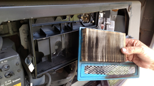 Internal combustion engines are basically big air pumps. The engine needs clean air to operate properly. Remove the air filter housing cover and check the air filter for cleanliness and for any dirt and debris.