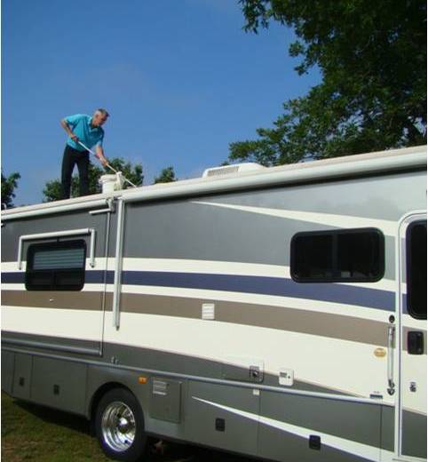 Clean your roof with an approved cleaner for the type of roofing material your RV has. Every time you clean the roof inspect the sealants around all of the openings and the seams on the roof. Water will take the path of least resistance, and if there is the smallest opening it will find it. Thoroughly inspect the roof sealants for potential leaks and reseal any areas of the roof seams and around openings where you suspect a leak. Make sure you use sealants compatible with your roofing material. Keep in mind that your warranty can be voided if you fail to perform some of these required inspections. Check your RV owner’s manual for roof inspection intervals.