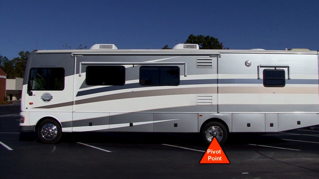 It doesn’t matter if you are driving a motorhome or towing a trailer, every vehicle has a pivot point. The pivot point is a fixed point on the vehicle at which the vehicle rotates around when making a turn. It sounds more complicated than it is. If it is a vehicle, like a truck or a motorhome with two axles the pivot point is the center of the rear axle.