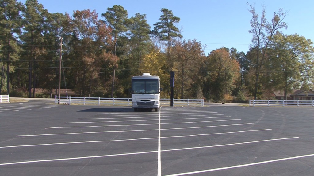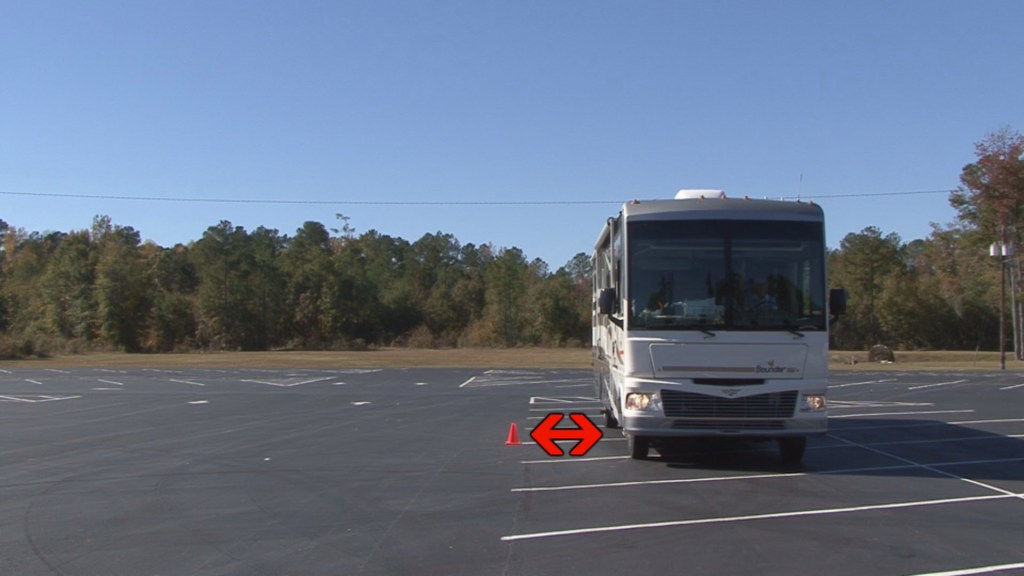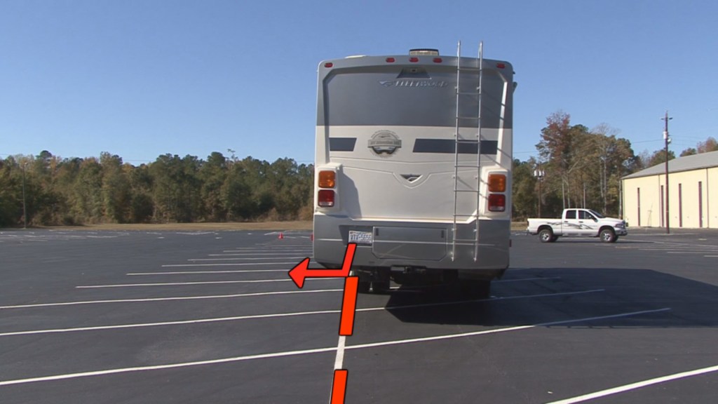 Establish reference points. In a car you have a hood in front of you to use as a sight, but in a motorhome you have very little in front of you to assist in staying centered in your lane and on course. While you are at the parking lot to establish your turn data, park the motorhome with the driver’s side of the coach alongside a long line.