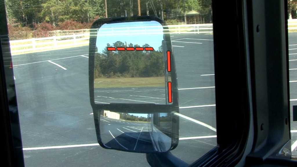 Adjust the flat part of the mirror so you can just see the side of your coach along the inside edge, and so you are looking back level with the ground about one-fourth of the way from the top of the mirror. You really don’t need to see a lot of sky. If the convex or “spot” mirrors are independently adjustable, set them the best you can so you can see out horizontally to the ground and alongside the coach.