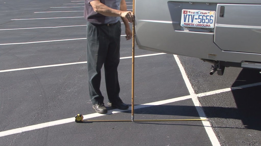 The first thing you need to do, to avoid this from happening, is know what your tail-swing measurement is. To do this park your motorhome or truck and trailer parallel directly alongside a straight line in an empty parking lot. Next, make a full lock turn in the direction opposite from the line and have someone measure the maximum distance the tail of the RV swings over the line as you slowly turn and drive away from the line. You will see the tail of the RV cross over the line. Take the measurement at the maximum point where the tail extends over the line. This is your tail-swing, and it represents the distance you need to park away from an object to avoid hitting it as you turn and move away from the object.